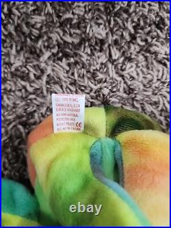The product is a rare 1996 Ty Beanie Baby Spike the Rhinoceros plush toy with tag errors. It belongs to the original Beanie Babies collection and is part of the character family of Beanie Babies. This collectible item is sought after by collectors and enthusiasts due to its unique errors on the tag, adding to its rarity and value in the Beanie Babies market. Beanie baby is in brand new condition.